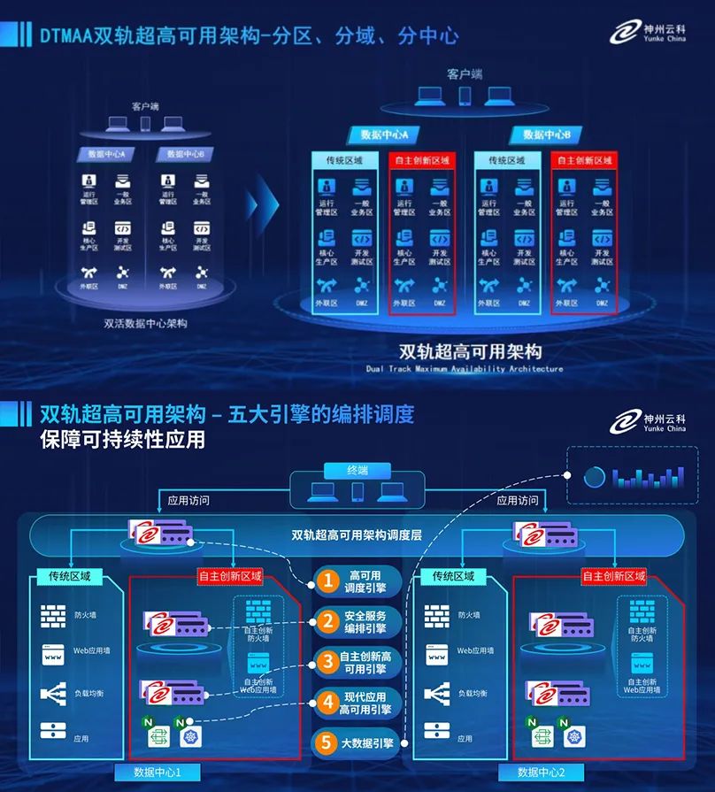 为助力银行业务高质量发展,更好地应对数字经济时代对可持续性的高要求,实现“信创”与“数字化”齐头并进,神州9500金沙创新性的推出了双轨超高可用架构。该架构在双活数据中心的分区调度基础上,增加信创域和非信创域的分域调度,实行信创域与传统域应用全量部署,使双中心运营变为双中心四区域并行运行,互为多活,将“0到1”的单轨建设道路变为分区分域协同的多活双轨超高可用架构。帮助客户在新架构下,保障“信创”的同时解决性能瓶颈,提升稳定性,保证应用可持续性,最终实现信创区域和非信创区域的平滑过渡,完成国产化替代目标。